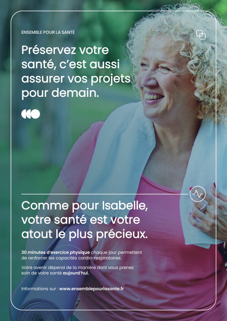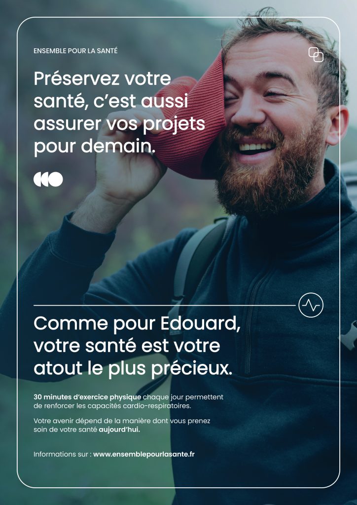 Conception d’une campagne d’affichage à destination du grand public, visant à promouvoir la prévention santé par l’activité physique. L’axe visuel met en avant des portraits chaleureux (ex. Édouard, Isabelle) et des messages personnalisés valorisant la santé comme un capital essentiel pour l’avenir.