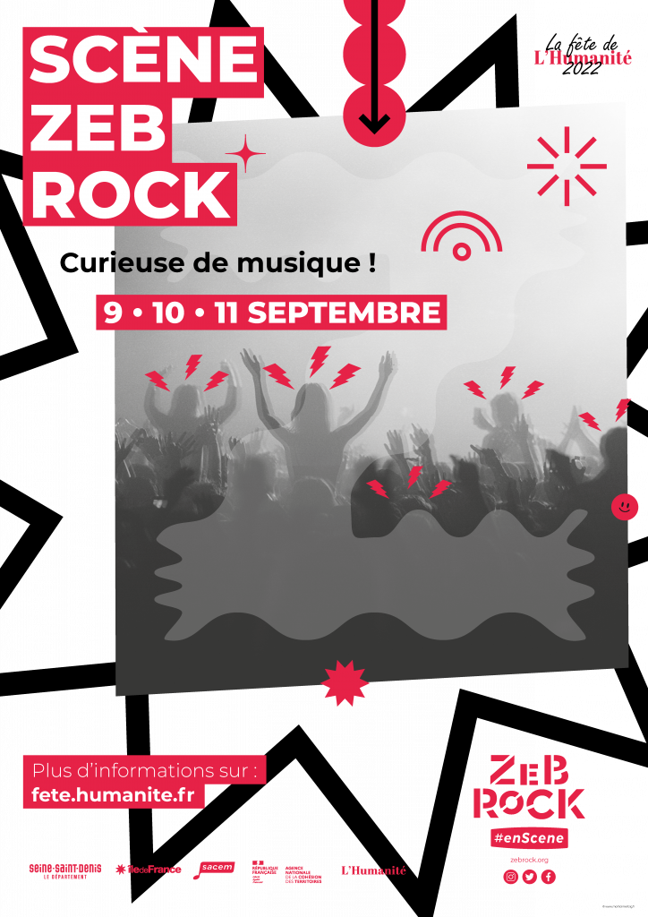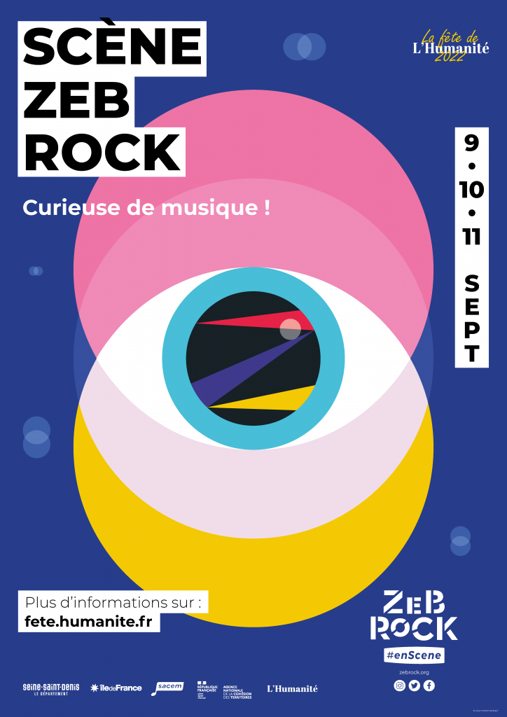 Ces deux affiches explorent deux univers graphiques distincts pour mettre en valeur la Scène Zebrock, espace musical engagé et éclectique de la Fête de l’Huma. La première affiche mise sur l’énergie brute du live : silhouettes d’une foule en liesse, éclairs visuels, couleurs vives… Le tout dans une composition dynamique qui évoque la puissance de la musique en direct. Son esthétique pop et audacieuse renforce l’idée d’un événement festif et vibrant. La seconde adopte une approche plus conceptuelle et graphique : un oeil stylisé, symbole d’une scène curieuse et attentive au monde, invite à voir et à écouter autrement. Les formes géométriques et les couleurs franches confèrent à l’affiche une esthétique contemporaine et intrigante. Deux visions complémentaires d’une même scène : libre, ouverte, et profondémen musicale.